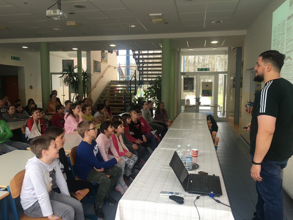 Za zaključek bralne značke smo povabili v goste raperja, igralca, komika in prevajalca Boštjana Gorenca Pižamo, ki so mu mladi bralci z zanimanjem prisluhnili. Otroke, ki so osvojili predšolsko bralno značko in bralce iz 1. in 2. razredov pa smo nagradili z izjemno zanimivo predstavo Sam Sebastjana Magica »Knjige velikanke«.